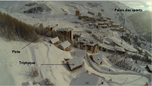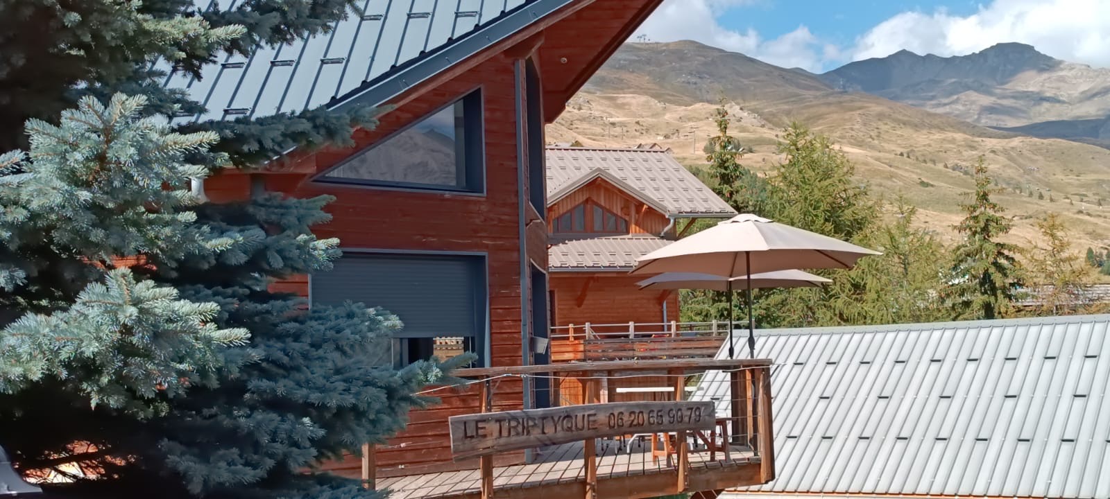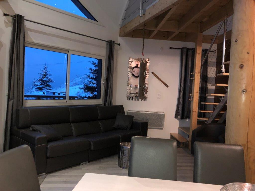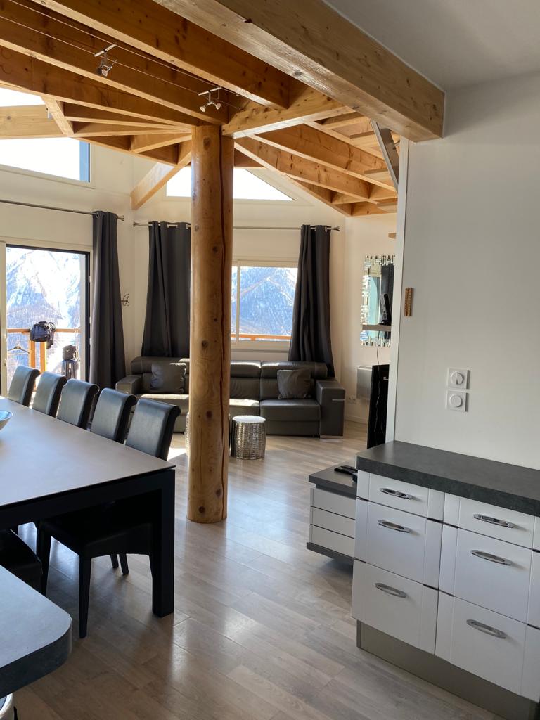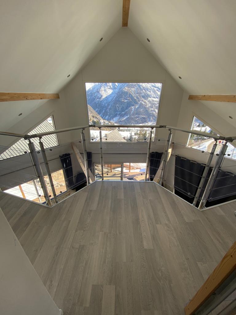 Grande baie vitrée donnant sur une terrasse de 20 m² en belvédère avec vue panoramique sur la station exposée plein sud.